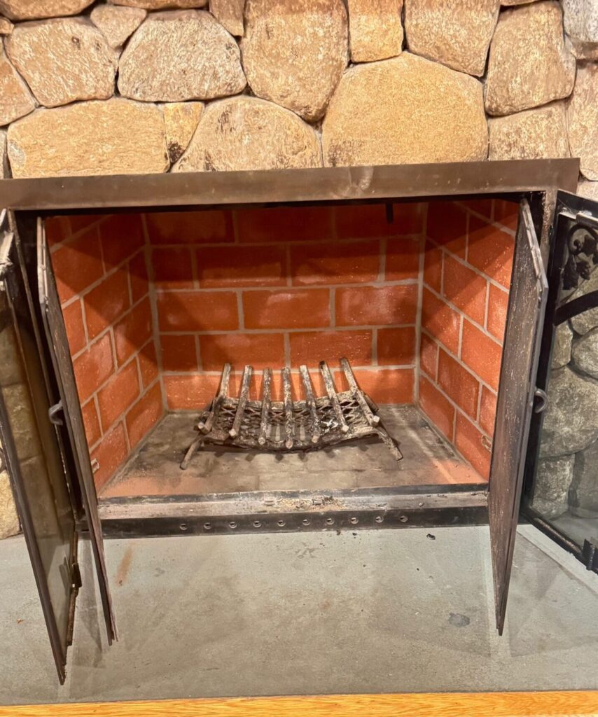 The smoke chamber and firebox are cleaned to remove accumulated deposits that can affect draft and fireplace performance.